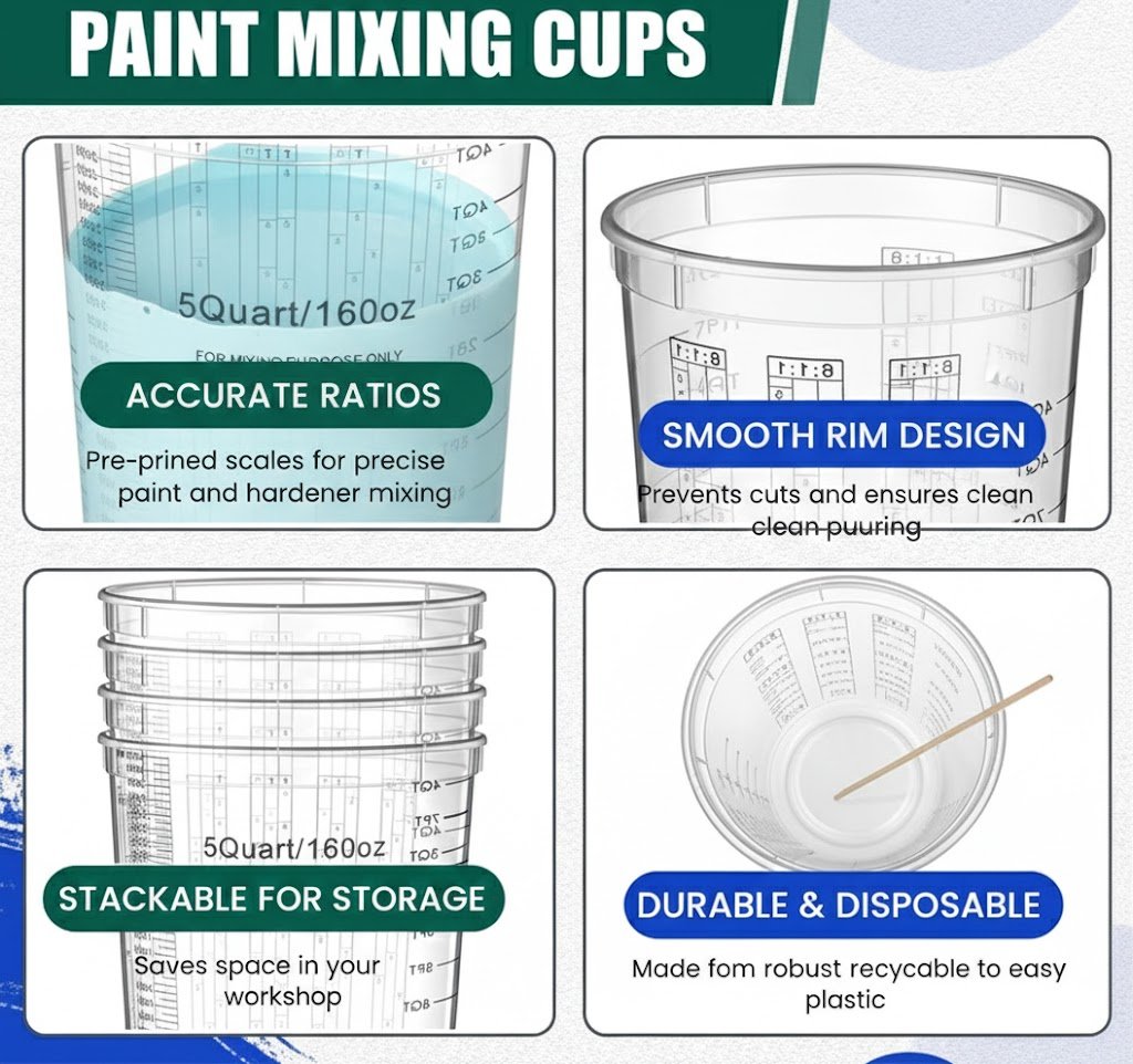 * 🎯 Absolute Precision Mixing: Eliminate guesswork. Every cup features crystal-clear, easy-to-read graduated markings and six common mixing ratios (1:1, 2:1, 3:1, 4:1, 6:1, and 8:1). Achieve perfectly measured, consistent mixtures for flawless results on every job, from stains to specialized coatings.